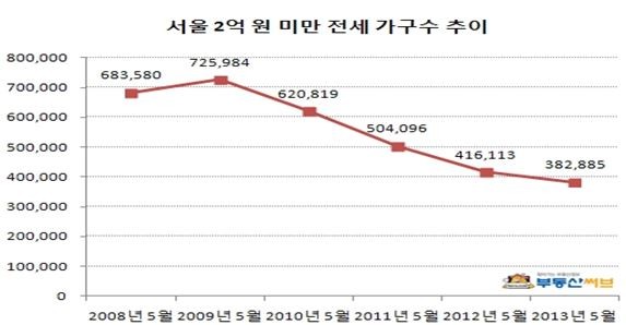 5월 넷째주 현재 서울 2억원 미만 전세 가구수는 총 38만2,885가구다.5년전인 2008년 5월 넷째주 기준 68만3,580가구와 비교하면,