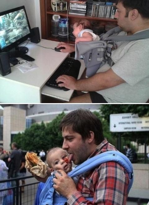 공개된 사진 속 아빠들은 아기띠에 아이를 안은 채 황당한 행동을 하고 있는 모습이 담겨 있다.