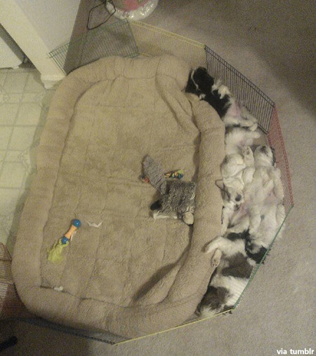 공개된 사진에는 여러 마리의 강아지들이 푹신하게 깔아둔 매트를 놔두고 매트 밖으로 둘러쳐진 울타리에 몰려 자고 있는 모습이 담겨 있다.