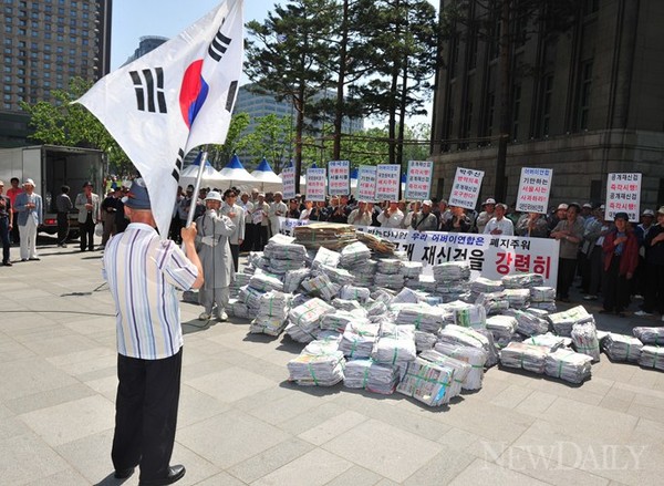 30일 오후<어버이연합> 회원들이 서울시청 정문 앞에서,서울시의 <국정원 대응 보고서> 규탄 집회를 열었다.