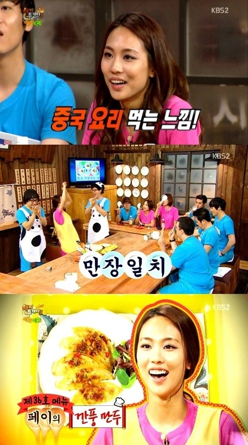 걸그룹 미쓰에이 페이의 깐풍 만두가 야간매점 메뉴에 등극했다.지난 30일 방송된 KBS2TV <해피투게더3>에는 글로벌 야간매점 특집으로 박준규, 2PM 택연, 존박, 미쓰에이 페이, 샘 해밍턴이 출연해 유쾌한 입담을 선보였다.