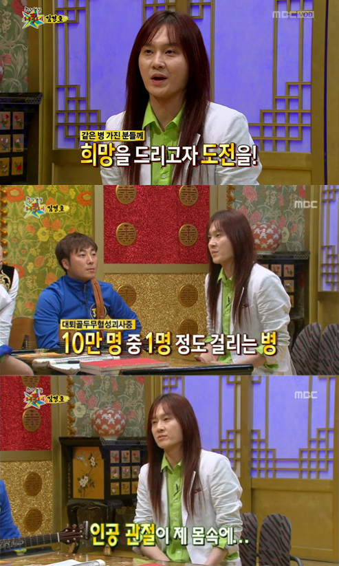 이날 김경호는 “대퇴골두무혈성괴사증이라는 희귀병에 걸렸다”며 “혈액순환이 잘 안 돼 다리 관절 부분의 연골이 녹아내리는 병이 생겼다. 10만 명 당 1명꼴로 발생하는 희귀병”이라고 털어놨다.