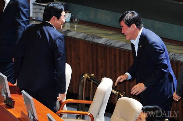 민주당 전병헌 원내대표(왼쪽)와 새누리당 최경환 원내대표(오른쪽)가 인사를 나누고 있다.