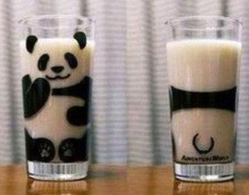 공개된 사진에는 검정색 무늬가 들어간 투명 유리컵의 모습이 담겨 있다. 그냥 보기에는 평범한 컵이지만 하얀 우유가 가득 차는 순간 숨어있던 판다의 모습이 나타난다. 컵의 뒷면에는 앙증맞은 꼬리까지 표현돼 눈에 띈다.