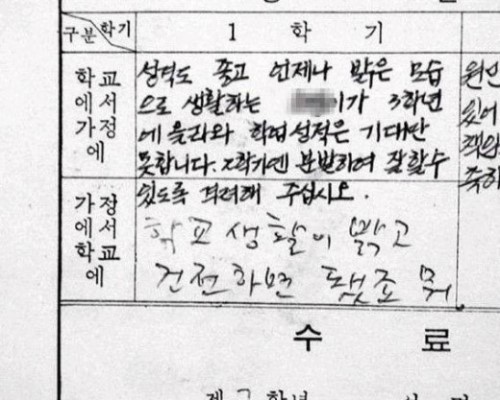 공개된 사진에는 한 교사가 학생 부모님에게 보낸 통지표의 일부가 담겨 있다. 담임교사는 학부모에게 “성격도 좋고 언제나 밝은 모습으로 생활하는 OO이가 3학년에 올라와 학업성적은 기대만 못합니다. 2학기엔 분발하여 잘 할 수 있도록 격려해 주십시오”라고 적었다.