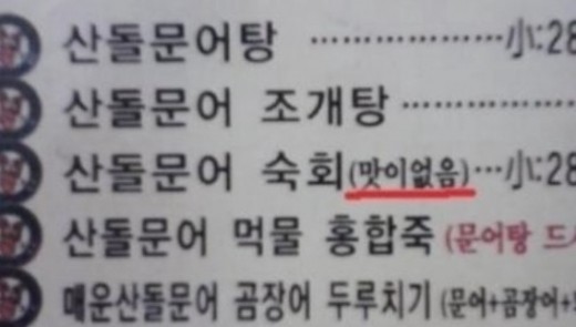 공개된 사진에는 한 음식점 메뉴판의 모습이 담겨 있다. 산돌문어를 이용한 다양한 메뉴가 나열돼 있는 가운데, 산돌문어 숙회 옆에 작게 [맛이 없음]이라는 문구가 적혀 있어 웃음을 자아낸다.