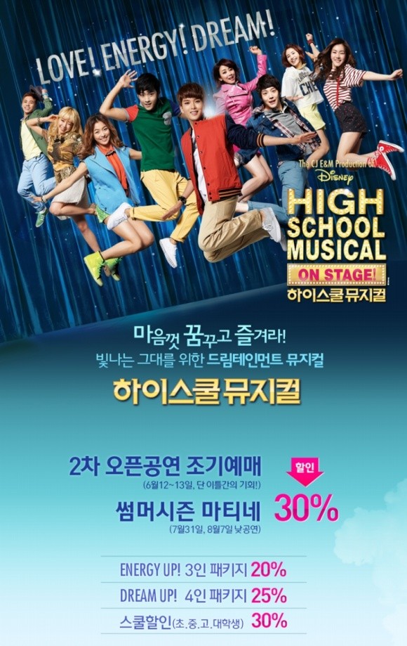 또한 <하이스쿨 뮤지컬>은 이번 2차 티켓박스 오픈을 기념해 조기 예매 할인 이벤트도 진행한다. 조기 예매 행사는 12일부터 13일까지 단 이틀간 진행되며, 티켓 예매시 좌석의 등급에 상관없이 30%의 할인율이 적용된다.