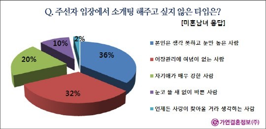설문조사 결과 응답자 36%가 소개팅 기피 1순위로 “본인은 생각 못하고 눈만 높은 사람”을 꼽았다.