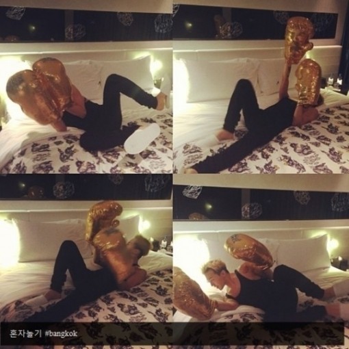 공개된 사진 속 지드래곤은 양손에 커다란 황금색 글러브 장갑을 낀 채 복싱을 하는 듯한 포즈를 취하며 침대 위를 이리저리 뒹굴거리고 있다.