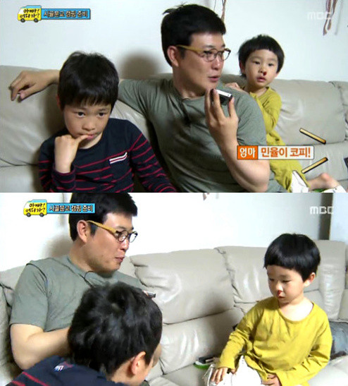 성동일은 전화 넘어 들려오는 소리에 “민율이가 커피 흘렸어?”라고 되물었고, 이에 김성주는 “민율이가 코피가 났다”고 상황을 설명했다. 그러자 성동일 아들 성준은 “민율이가 코 팠나봐요”라고 말해 웃음을 자아냈다.