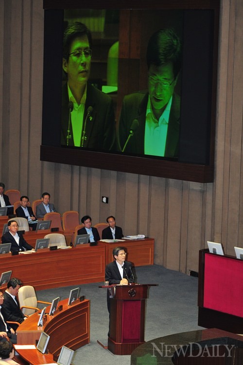 황교안 법무부장관이 10일 서울 여의도 국회 본회의장에서열린 정치분야 대정부질의에서 신경민 민주당 의원의 [국정원 사건] 질의에 답변하고 있다.