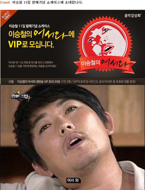 가수 이승철이 Mnet <슈퍼스타K>에서 나온 자신의 유행어 “어서와”를 이용한 쇼케이스 포스터가 공개돼 화제다.네이버 뮤직은 오는 18일 진행되는 이승철의 11집 쇼케이스 현장 중계 홍보에 <슈퍼스타K4> 출연 당시 이승철의 모습을 그대로 패러디해 폭소를 자아냈다.