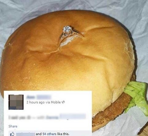 공개된 사진 속에는 햄버거 빵위에 다이아몬드 반지가 끼워져 있다. 특히, 청혼을 받은 여성은 결혼을 승낙한 것으로 알려졌다.