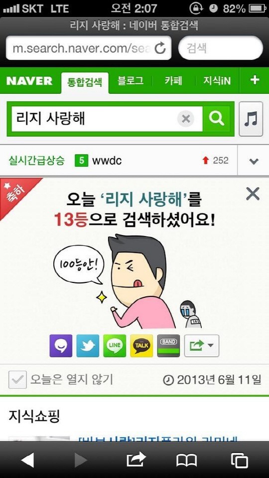 게재된 사진에는 포털 사이트 검색창에 “오늘 리지 사랑해를 13등으로 검색하셨어요!”라는 이미지가 담겨 있다. 자신 외에도 [리지 사랑해]라는 문구를 12명의 네티즌들이 더 검색한 것.