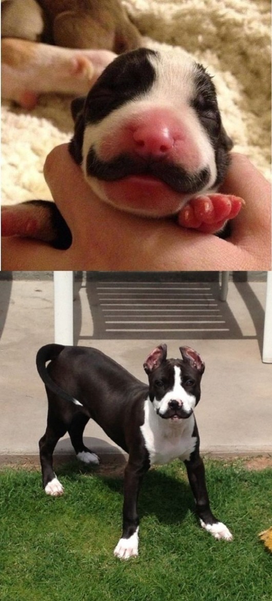공개된 사진에는 이제 막 태어난 강아지와 시간이 지나 훌쩍 자란 성인견의 모습이 담겨 있다. 특히, 이 강아지는 코 밑에 영국 신사의 상징인 콧수염 모양의 긴 털이 있으며, 성인견이 되어서도 여전히 콧수염이 그대로다.