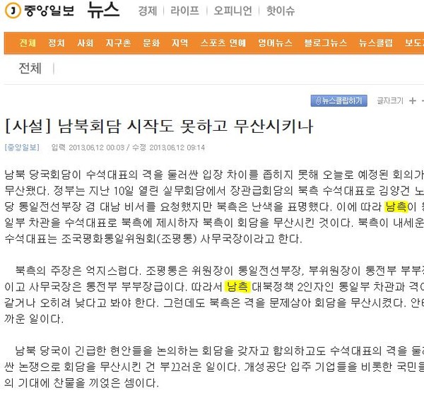 <남북회담 시작도 못하고 무산시키나>는 제목으로