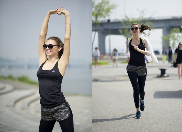 지난 11일 내한한 세계적인 톱모델 미란다커의 조깅 모습이 포착됐다.미란다 커는 내한 중 빡빡한 스케줄에도 불구하고 한강을 달리며 가벼운 스트레칭을 하는 등 관리를 철저히 하는 톱모델다운 모습을 보였다. 그녀는 군살 하나 없이 완벽한 몸매를 유지하고 있는 비결로 오전에 하는 조깅과 요가를 꼽은 바 있다.