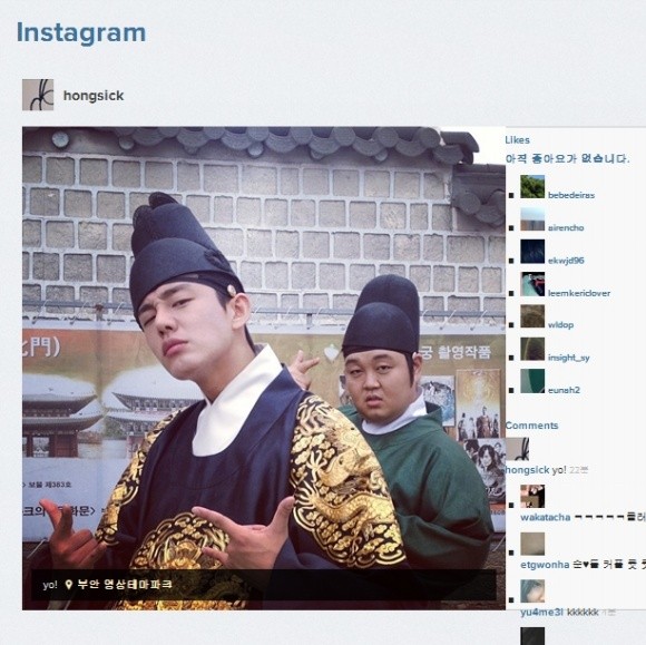 유아인은 13일 자신의 트위터에 “부안 영상테마파크”라는 제목과 함께 SBS 월화드라마 <장옥정, 사랑에 살다> 현장 사진을 공개했다.