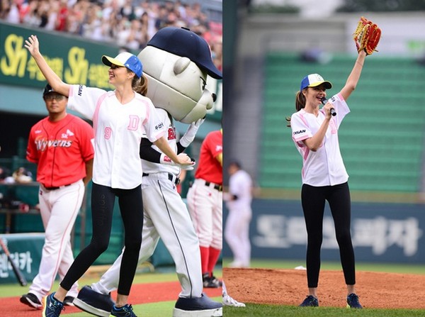 미란다 커의 시구패션은 노출 없이도 충분히 섹시할 수 있다는 것을 알려준 개념이 충만한 스타일이었다.이날 미란다 커는 두산의 퀸스데이 행사를 맞아 한글로 [미란다 커]라는 자신의 이름을 새긴 두산의 핑크색 유니폼에 완벽한 바디 라인이 돋보이는 타이트한 블랙 레깅스 팬츠를 입고 등장해 눈길을 끌었다.