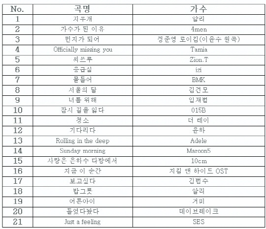 14일 오후 엠넷 <슈퍼스타K 5>(이하 슈스케5)의 제작진이 금지곡으로 공개한 노래는 총 21곡이다.