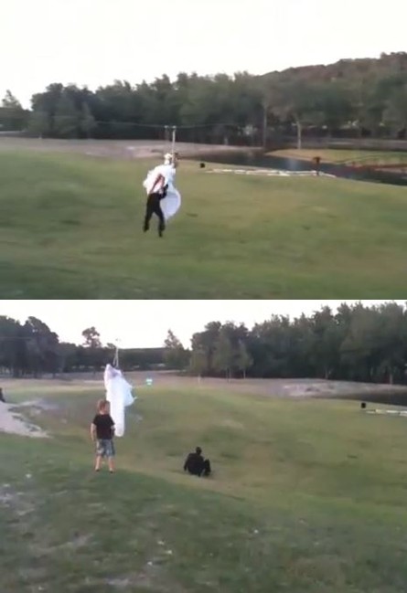 하지만 신부의 뒤를 따르던 신랑은 가속도 때문에 앞서가던 신부와 충돌 후 약 2M 높이에서 떨어져 보는 이들을 놀라게 했다. 다행히 신랑은 신부에게 괜찮다는 사인을 보낸 후 두 팔을 벌리며 신부를 맞이해 훈훈하게 마무리 지었다.