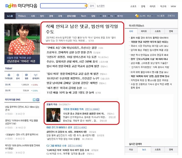 멘션이 게재돼 있다.[국정원 댓글 사건]을 사회적 빅이슈로 만들려는 <다음>의 의도가 엿보이는 부분이다.