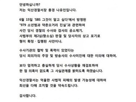 익산경찰서가 [사건을 재검토를 하겠다]는 공식 입장을 표명했다.익산경찰서장은 16일 공식 홈페이지를 통해