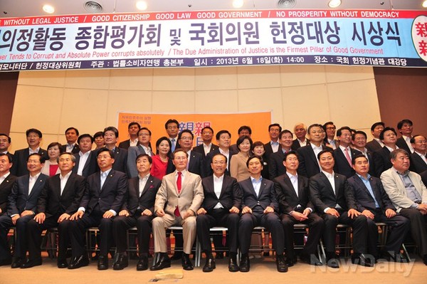 18일 오후 서울 여의도 국회 헌정기념관 대강당에서 열린<국회의원 의정활동 종합평가회 및 국회의원 헌정대상 시상식>에서헌정대상 수상의원들이 기념촬영을 하고 있다.<헌정대상>은 270여 시민-사회단체가 함께 하는<국정감사 NGO 모니터단>이 주관하는 행사로써 8개의 항목을지표화 하여 평가 수상한다.<헌정대상 수상의원>이미경, 강창일, 김기현, 김우남, 김재윤, 김진표, 김춘진, 박기춘, 양승조, 오영식, 오제세, 우윤근, 장윤석, 정희수, 주승용, 강석호, 권성동, 김광림, 김상희, 김세연, 김영록, 김영주, 김태원, 김현미, 김희정, 나성린, 백재현, 유기홍, 유일호, 이명수, 이윤석, 이진복, 이춘석, 정문헌, 전성호, 정수성, 정청래, 홍문표, 홍영표, 홍일표, 강기윤, 강은희, 권은희, 김관영, 박민수, 박완주, 박인숙, 박홍근, 신경림, 신동우, 신장용, 유승우, 윤명희, 윤재옥, 이노근, 이언주, 이완영, 이자스민, 이재영, 이헌승, 이현재, 최봉홍, 함진규