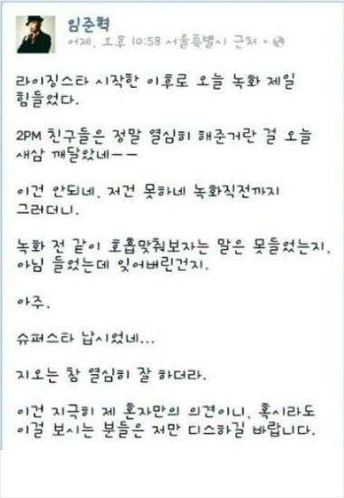 앞서 임준혁은 최근 자신의 페이스북에 “라이징 스타 시작한 이후로 오늘 녹화 제일 힘들었다. 2PM 친구들은 정말 열심히 해준 거란 걸 오늘 새삼 깨달았네”라는 글을 게재해 이목이 집중됐다.