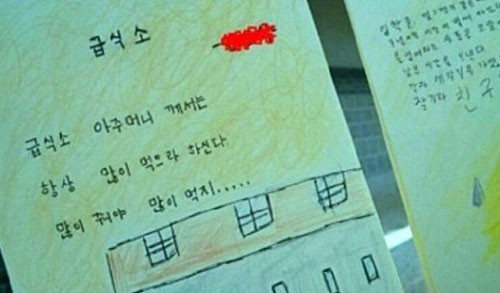 공개된 사진에는 한 초등학생이 쓴 <급식소>란 제목의 그림 시가 담겨 있다. 해당 시에는 “급식소 아주머니께서는 항상 많이 먹으라 하신다. 많이 줘야 많이 먹지”라고 짧게 적었다.