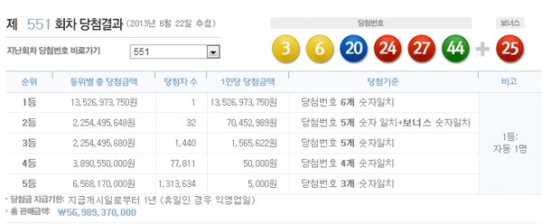 2013년 6월 22일 실시된 제551회 나눔로또 1등 당첨번호는 ‘3, 6, 20, 24, 27, 44’번이며, 2등 보너스 번호는 25번이다.