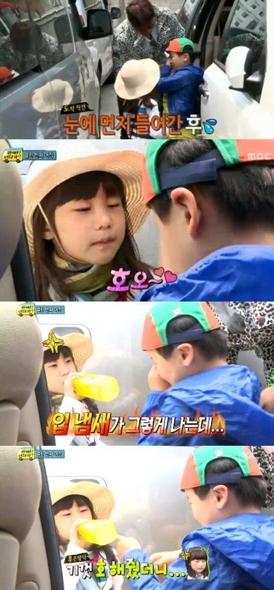 이날 여행지에 도착하기 전 윤후는 한쪽 눈에 먼지가 들어가 제대로 뜨지 못했다. 이에 윤민수가 지아에게 “윤후 오빠 눈 다쳤어. 호~ 해줘”라고 부추겼다.