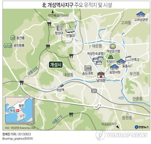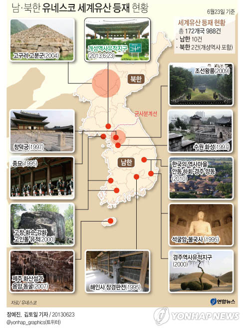 유네스코는 23일 캄보디아 프놈펜 평화궁전에서 계속된 제37차 세계유산위원회(WHC)에서 북한이 등재 신청한 개성역사유적지구를 심사한 결과 세계유산 등재를 확정했다. -