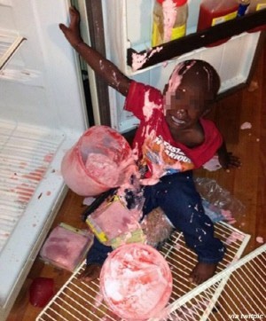 공개된 사진에는 이이스크림이 범벅이 된 채 냉장고 앞에서 주저앉아 울고 있는 한 아이의 모습이 담겨 있다. 이 소년은 자신의 키보다 높은 곳에 있던 아이스크림을 꺼내려다 선반이 무너지면서 아이스크림이 쏟아진 것으로 보인다.