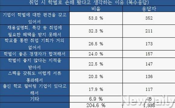 응답자의 50.4%가 [학벌 때문에 손해를 봤다]라고 답했다.