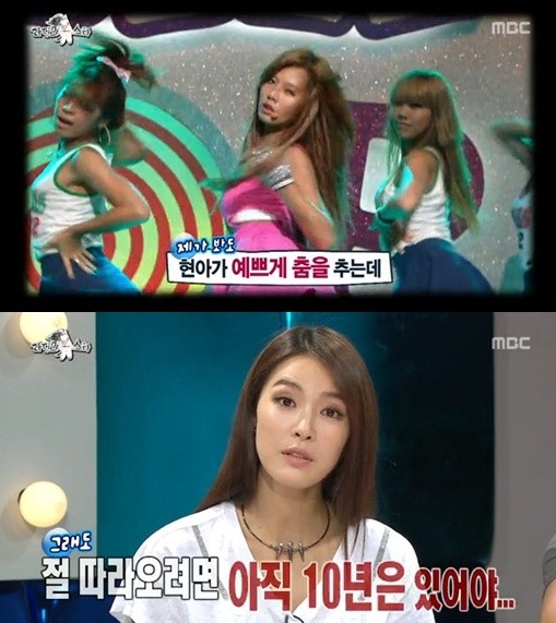 이에 가희는 “현아는 내가 봐도 굉장히 예쁘게 춤을 춘다”며 “그래도 나를 따라오려면 10년은 더 있어야 한다”고 말해 웃음을 자아냈다.