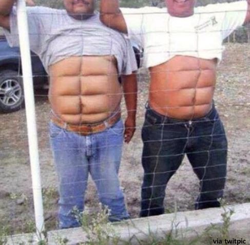 공개된 사진에는 배가 한껏 나온 두 명의 남성이 티셔츠를 걷어 올린 채 철조망에 앞에 서 있는 모습이다. 특히, 두 남성의 불룩한 배가 철조망에 밀착돼 가짜 식스팩을 만들어 폭소를 자아냈다.