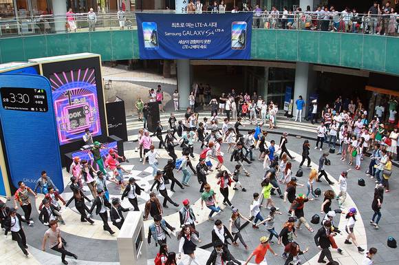 ▲ 삼성전자는 지난 30일 서울 합정동 메세나폴리스에서 세계 최초 LTE-A 시대를 연 '갤럭시 S4 LTE-A' 출시를 기념해 플래시몹 형태의 대규모 퍼포먼스를 진행했다.