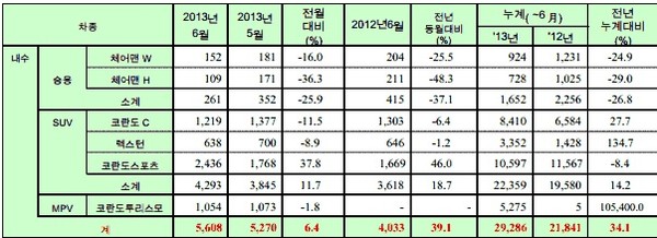 6월 <쌍용차>의 판매 대수는 5,608대다.