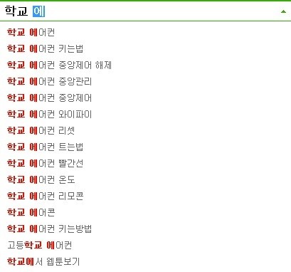 검색 목록엔 [학교 에어컨 와이파이], [학교 에어컨 키는 법], [학교 에어컨 중앙제어관리], [학교 에어컨 리모콘], [학교 에어컨 중앙제어 해제] 등 더운 학생들의 심정을 대변하는 단어가 눈에 띈다.