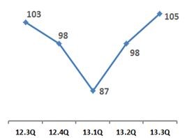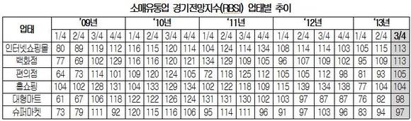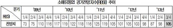 3분기 전망치가 전분기보다 7포인트 상승한 [105]로 집계됐다.소매유통업 경기지수가 기준치인 100을 웃돈 것은