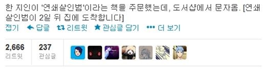 공개된 사진은 한 네티즌이 트위터를 통해 올린 글을 캡처한 것. 작성자는 “한 지인이 <연쇄살인범>이라는 책을 주문했는데, 도서샵에서 문자가 왔다”고 전했다.