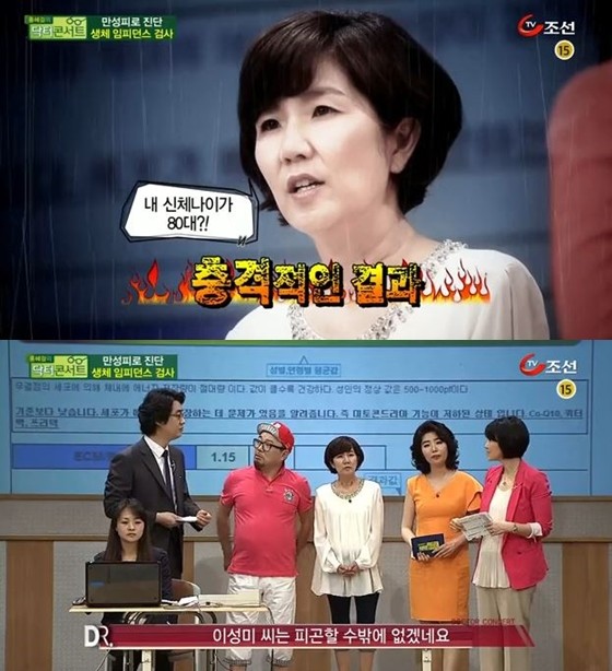 이날 이성미는 50대 초반의 나이임에도 신체영양상태 평균값에 훨씬 못 미치는 수치인 [영양 상태 결함]이라는 판정과 함께 신체 나이 80대라는 측정을 받았고, 예상치 못한 결과에 출연진들은 놀라움을 금치 못했다.