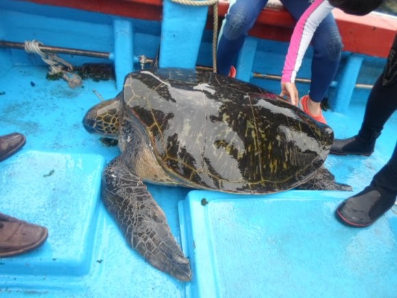 제주해양경찰서에 따르면 이날 그물에 걸린 푸른바다거북의 몸 길이는 97cm에 이르며, 암컷으로 무려 200~300살인 것으로 추정된다.