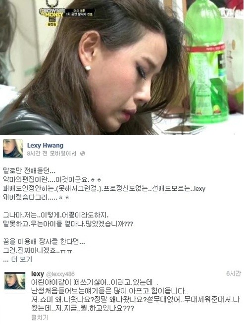 가수 렉시는 6일 자신의 페이스북을 통해 “말로만 전해듣던 악마의 편집이란 이것이군요. 패배도 인정 안하는(못해서 그런 걸) 프로정신도 없는 선배도 모르는 렉 돼버렸슴다그려”라는 글을 게재했다.