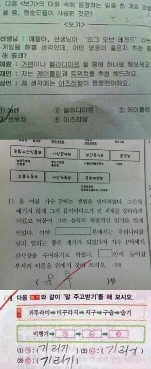 원순모음을 묻는 국어 시험지에 나온 예문에 온라인게임 <리그 오브 레전드>의 캐릭터 이름을 보기로 제시했다.