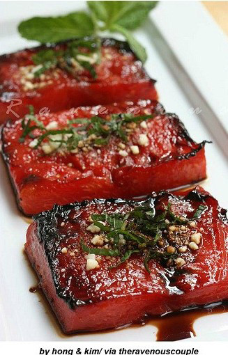 수박 스테이크가 등장했다.최근 온라인 커뮤니티 게시판에는 [참치 맛 나는 수박 스테이크]라는 제목으로 사진이 게재됐다.