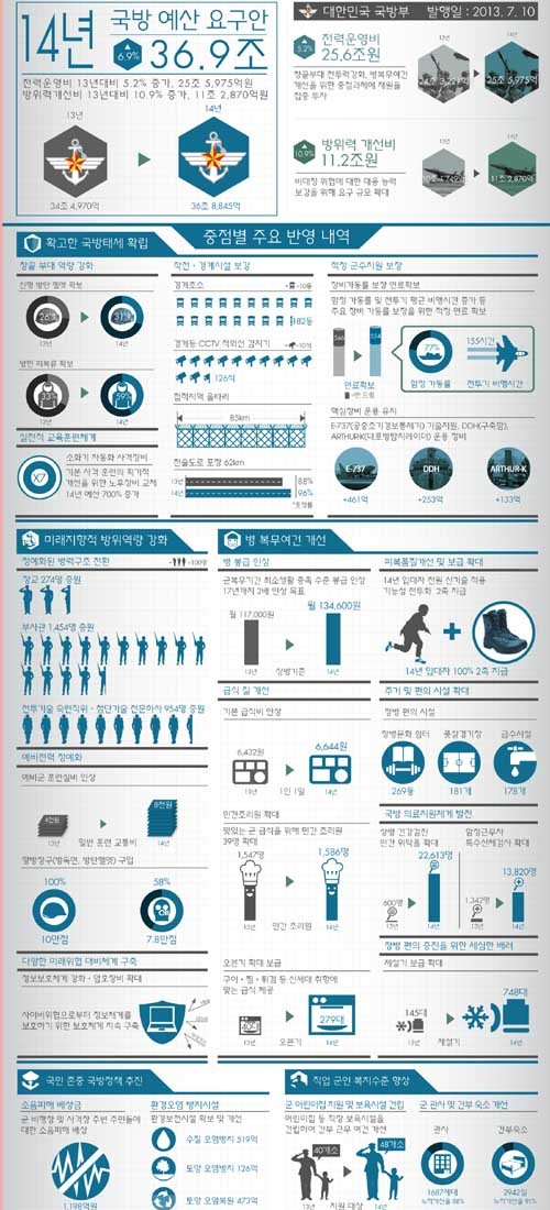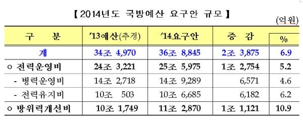 2014년 국방예산 요구안 규모는 2013년 국방예산 34조 4,970억 원보다 6.9% 증가했다.