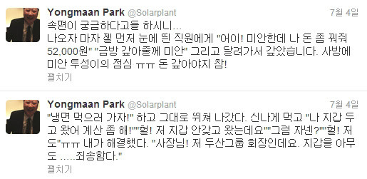 박 회장은 외상값을 바로 갚고 난 다음에 다시 트윗을 날렸다.
