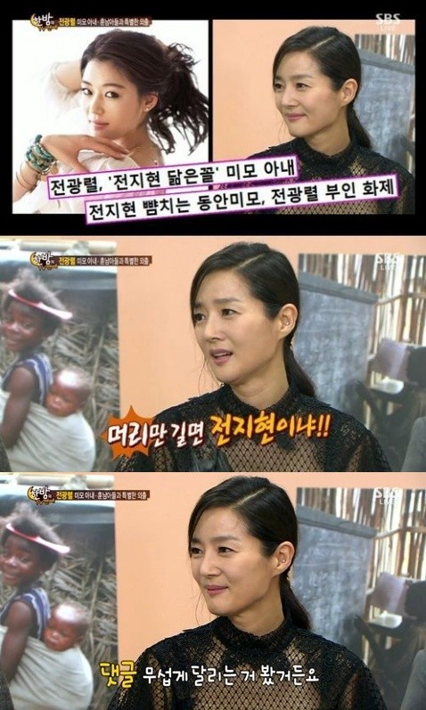 이날 전광렬 아내 박수진 씨는 리포터 조영구가 전지현과 닮은꼴이라는 말을 꺼내자 “인터넷에 기사가 나온 적이 있는데 댓글에 ‘머리만 길면 전지현이냐’고 하더라. 댓글 무섭게 달린 걸 봤다”고 말했다.